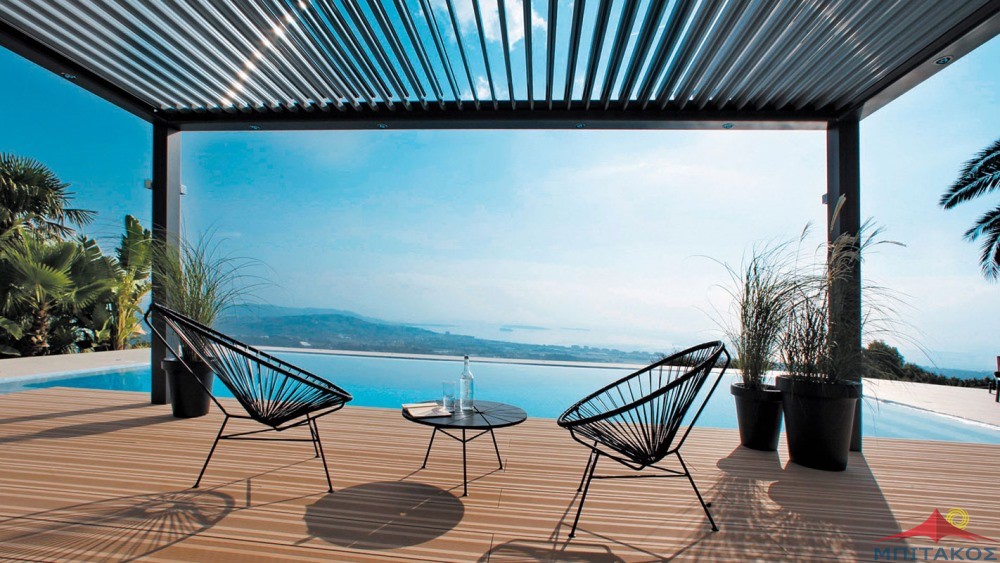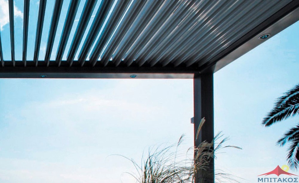 Το νέο σύστημα Pergola είναι ένα πρωτοποριακό στεγανό σύστημα σκίασης εξ’ολοκλήρου από αλουμίνιο με περιστρεφόμενες περσίδες, το οποίο παρέχει προστασία από την ηλιακή ακτινοβολία σε συνθήκες ηλιοφάνειας, αλλά και από τη βροχή ή το χιόνι με σύστημα ελεγχόμενης απορροής υδάτων.